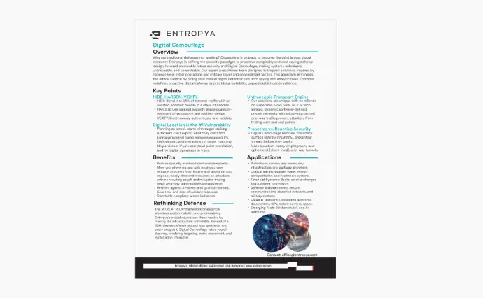Why are traditional defenses not working? Cybercrime is on track to become the third largest global economy. Entropya is shifting the security paradigm to proactive complexity and cost saving defense design, focused on durable future security and Digital Camouflage, making systems unfindable, untraceable, and unreachable.